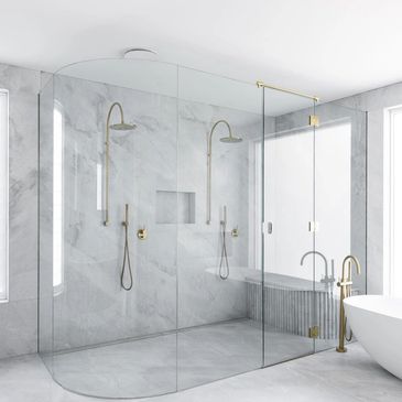 Unparalleled luxury, this 10mm curved glass shower screen we designed for our client, with the scope of a floor to ceiling screen, we were able to identify and advise our client that a curved panel wouldn‘t be able to be rotated into its intended position, with this catching all parties off guard this illustrates the experience and foresight that our team possess.